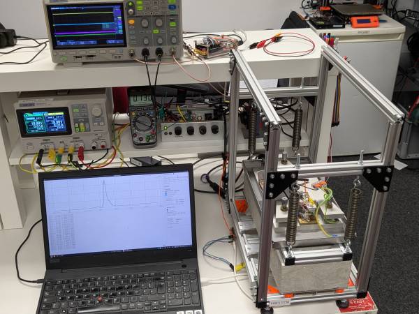 Measuring the damping time of the STM block (without magnet damping). STM block is deflected by 4cm, we measure the time until the amplitude is half. Target is to measure the increase in damping by our eddy current brake. Time is 4,5 seconds.